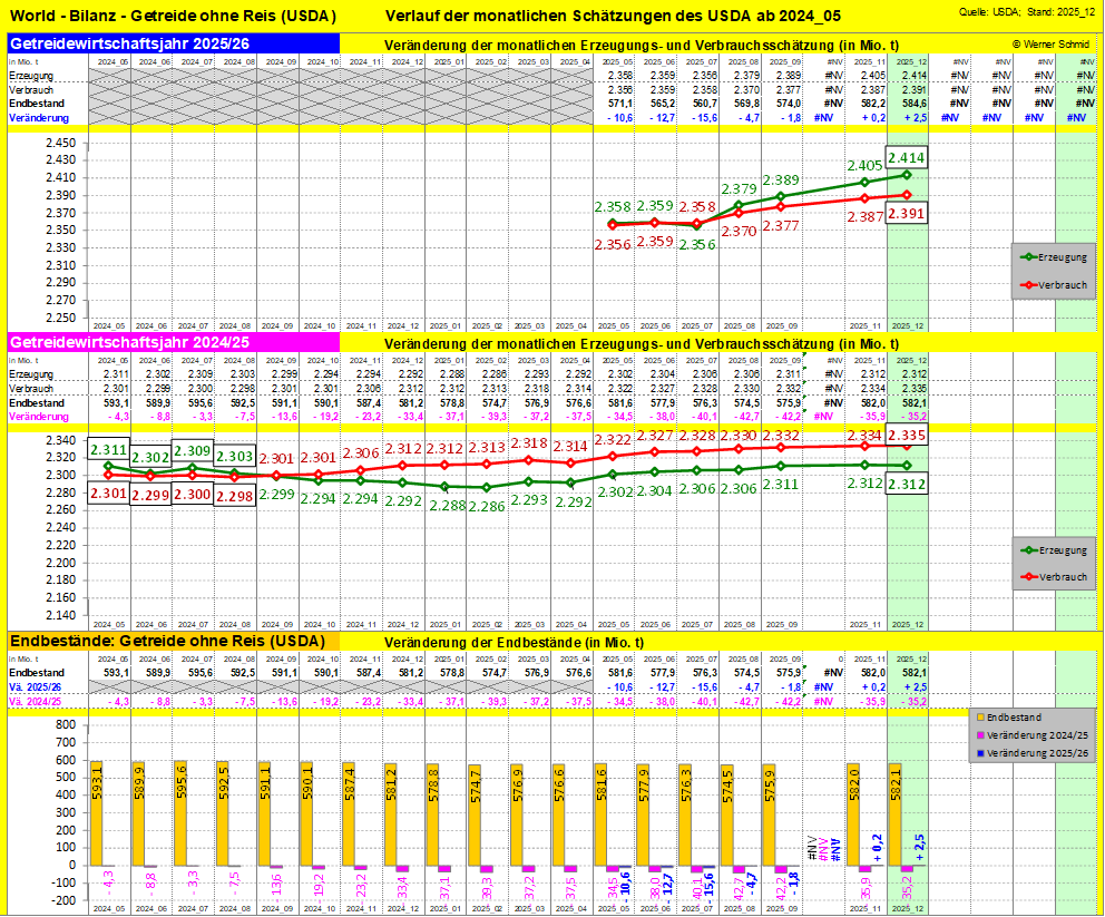 Fazit zur 7. Einschätzung der Bilanz 2025/26 im Dezember 2025 durch das USDA: Selbst bei weltweiten Spitzenernten, sowohl im Getreide-