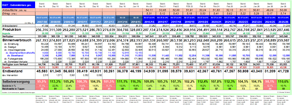 der Getreideernte 2025/26 im Mai 2025 noch eine Erntemenge von 2.358 Mio.t erwartet, so liegt die Januarschätzung mit 2.433 Mio.t um