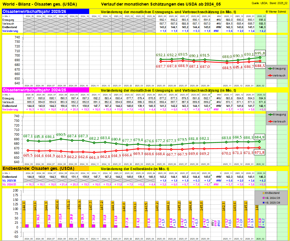 Die Ölsaatenernte 2025/26 sieht das USDA in seiner Februarschätzung erneut leicht optimistischer. Die Welt erwartet hier mit