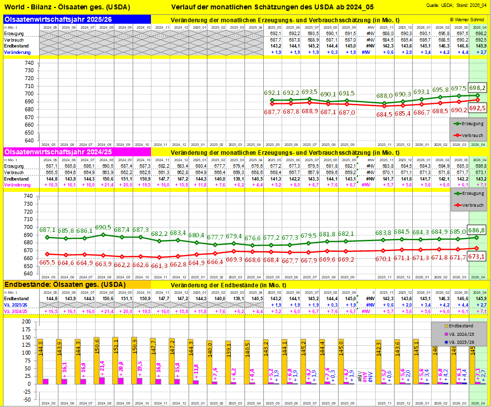 Aprilschätzung mit 2.442 Mio.t um +84 Mio.t darüber. Gleiches, wenn auch etwas abgemildert, gilt für die Ölsaaten. Das
