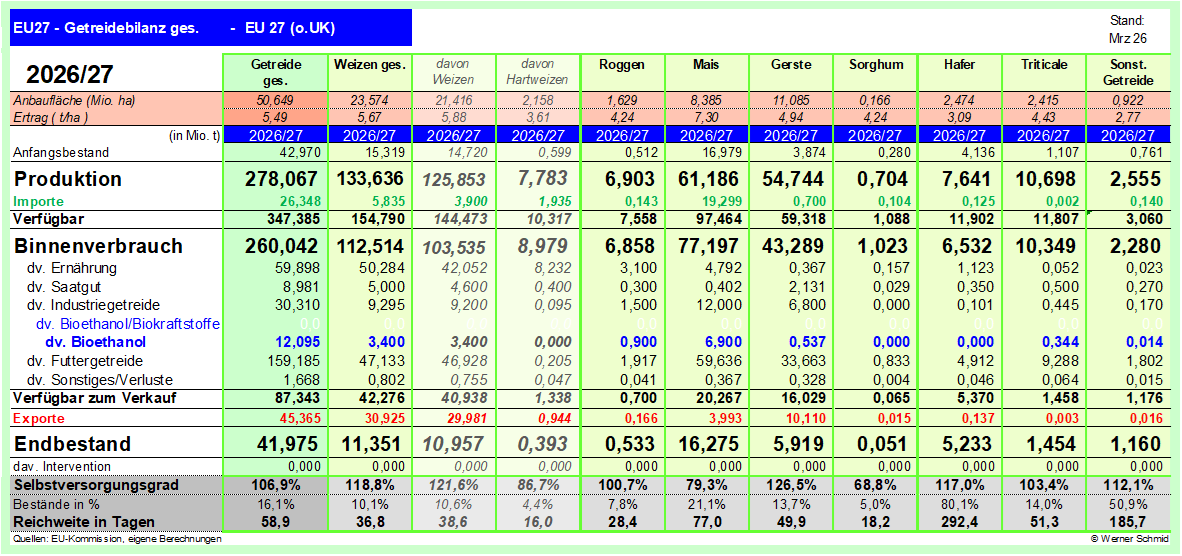 mit 2.442 Mio.t.. Das liegt mit einem Plus von rund 7 Mio.t erneut oberhalb der Vormonatsschätzung. Mehr Getreide soll in der EU-27,