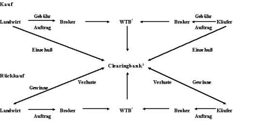 Einem normalen Landwirt ist es nicht erlaubt, an einer Warenterminbörse direkt zu handeln. Der Handel muss stets über einen Mittler (Broker oder Makler) erfolgen, der als Mittelsmann zwischen Warenterminbörse und dem Landwirt fungiert.