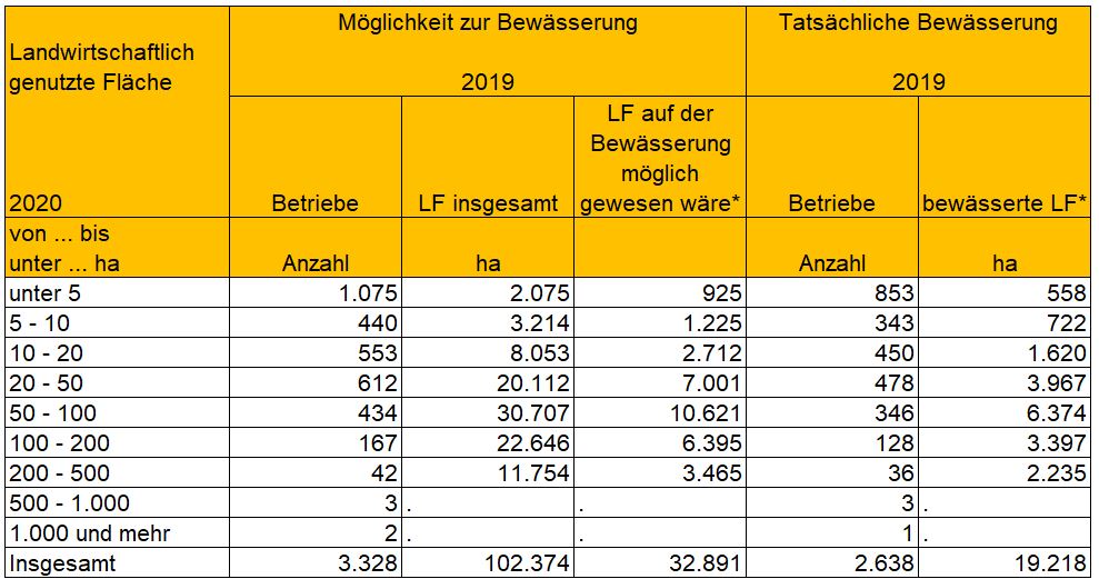 Im Rahmen der Landwirtschaftszählung 2020 wurden die landwirtschaftlichen Betriebe mit Bewässerungsmöglichkeit zuletzt erfasst.