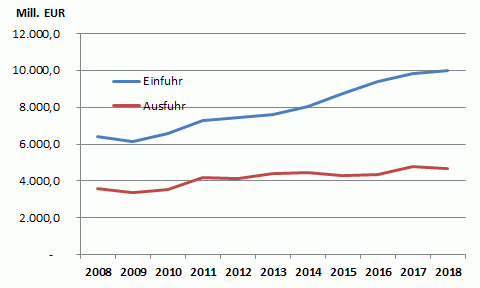 Während im Zeitraum 2008-2018 die Einfuhren um 3,5 Mrd. Euro angestiegen ist, ein Plus von 55 %, haben sich die Ausfuhren im Vergleich dazu schwächer entwickelt. Ihre Zunahme liegt bei 1,1 Mrd. Euro oder 31 %.