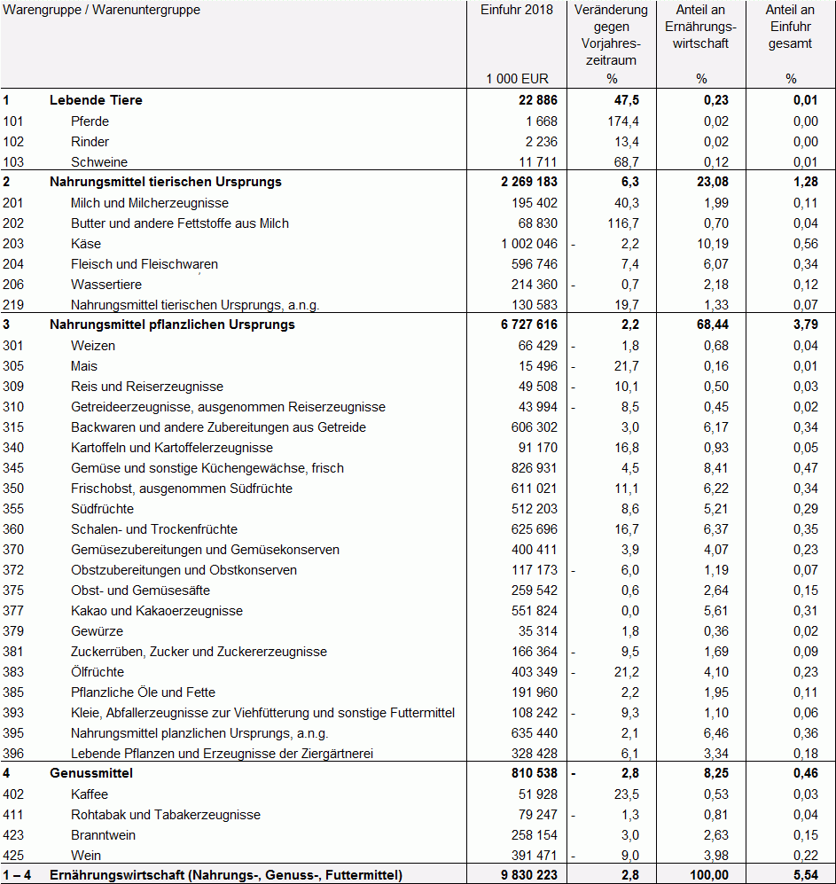 Tabelle: Einfuhr Baden-Württemberg 2018 nach Warengruppen und Warenuntergruppen der Ernährungswirtschaft und der Gewerblichen Wirtschaft