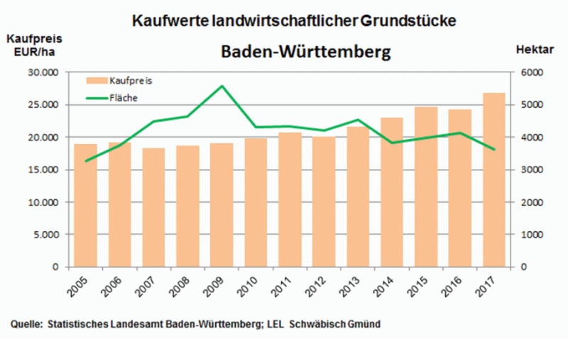 Der Kaufwert je ha hat sich kontinuierlich von 17.000 € (2008) auf 27.800 € gesteigert. 2017 wurden mit 42.900 €/ha die höchsten Preise im Kreis Böblingen bezahlt, gefolgt vom Kreis Ludwigsburg (40.200 €) und dem Alb-Donau-Kreis mit 38.000 €.