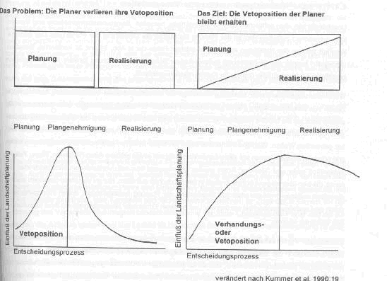 Auch muss das Verhältnis Planung / Realisierung bei der Biotopvernetzung neu überdacht und abgestimmt werden. Wie die Untersuchung belegt, ist es gerade im landschaftsplanerischen Themenbereich nicht sinnvoll, eine strikte Trennung von Planung und Realisierung einzuhalten, wie dies oft geschieht, da „landschaftsplanerischer Fachverstand in allen Projektphasen und nicht nur während der Projektierung im Vorfeld der Umsetzung notwendig ist“. Angestrebt wird statt dessen eine stärkere Durchmischung von Planungs- und Umsetzungsphase unter intensiverer Mitwirkung/Austausch aller Beteiligter.