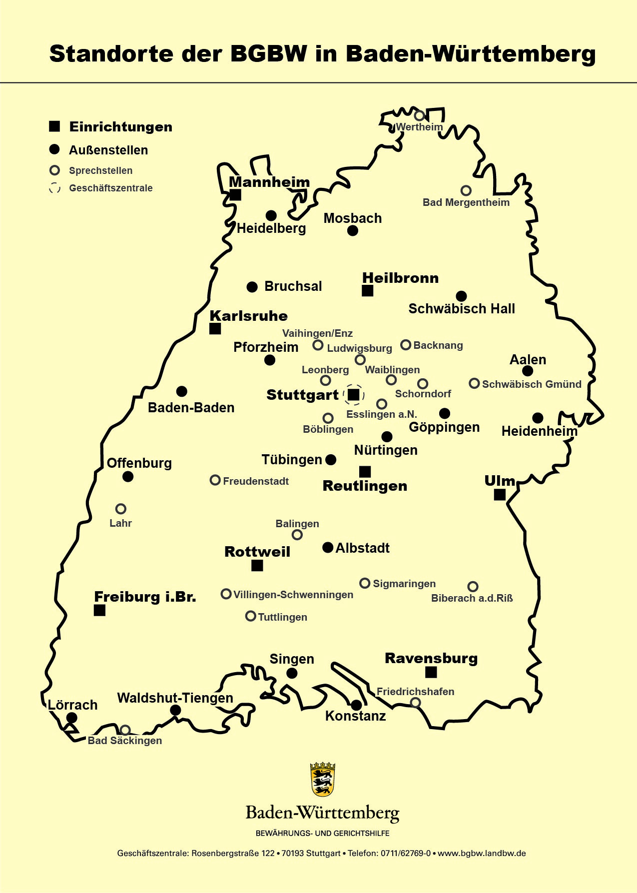 Die Bewährungs- und Gerichtshilfe (BGBW) ist in Form einer Anstalt des öffentlichen Rechts organisiert und hat ihren Sitz in Stuttgart. Neben der Geschäftszentrale bestehen landesweit neun örtliche Einrichtungen (Freiburg, Heilbronn, Karlsruhe, Mannheim, Ravensburg, Reutlingen, Rottweil, Stuttgart, Ulm) sowie 35 Außen- und Sprechstellen. Durch diese Flächenpräsenz soll jede Klientin und jeder Klient möglichst wohnortnah betreut werden.